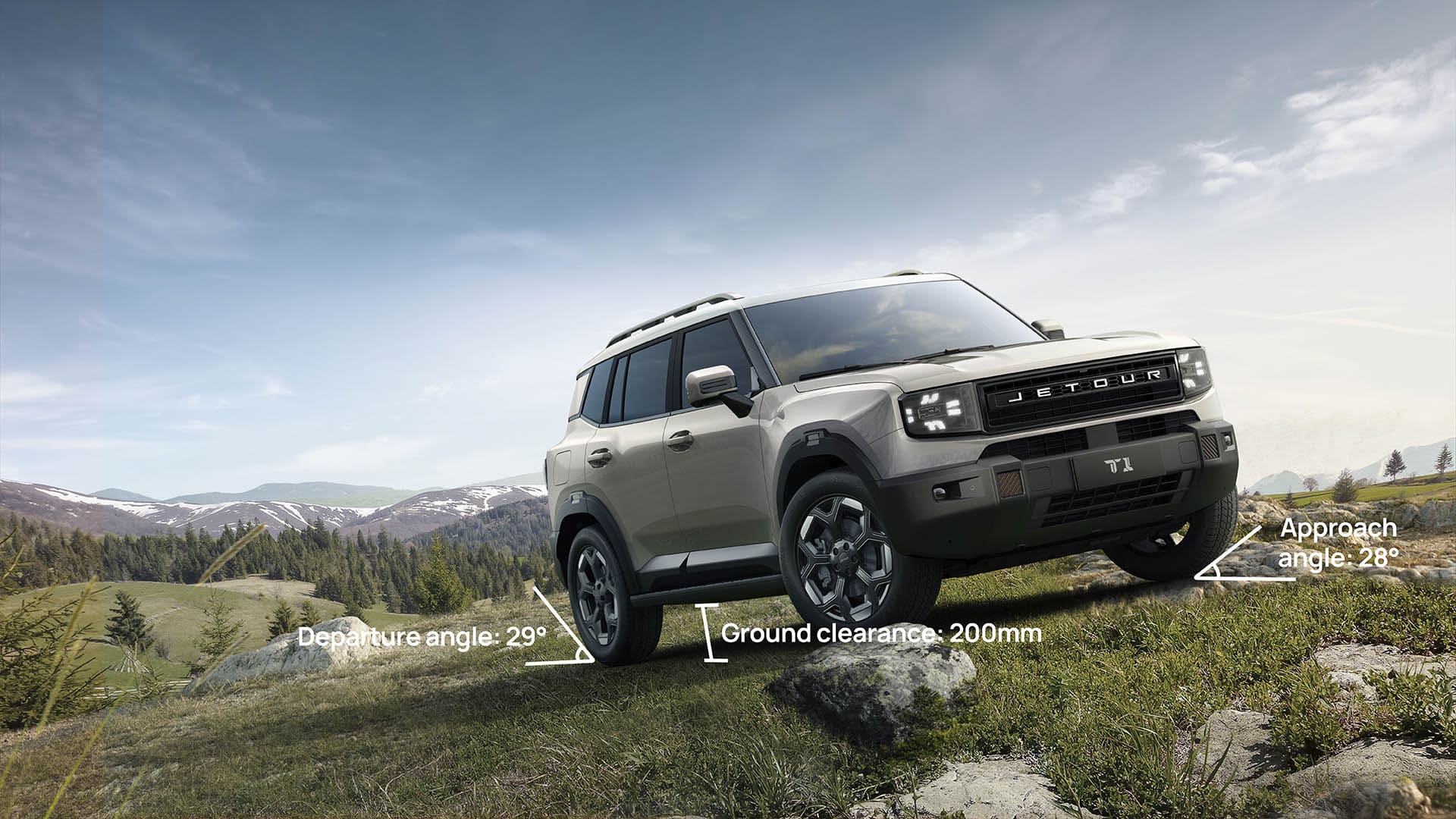 Capabilitățile off-road ale noului Jetour T1 răspund pe deplin nevoilor iubitorilor de auto în majoritatea condițiilor de condus off-road: garda la sol minimă este de 200 mm, unghiurile de intrare și ieșire sunt de 28° și 29° respectiv, iar mașina poate traversa un șanț cu adâncimea de până la 700 mm.